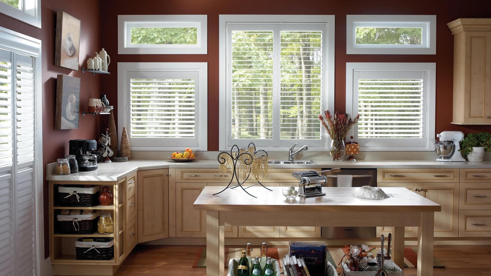 Beaucoup d'entre nous ont des fenêtres au-dessus de l'évier ou près de la cuisinière. Quel que soit l’habillage de fenêtre que vous décidez d'ajouter à votre cuisine, n'oubliez pas qu'il devra être nettoyé à un moment ou à un autre. La cuisine est une source de graisse, d'huiles et d'odeurs provenant des aliments que vous cuisinez. Il est donc important de choisir un style qui résiste à ces facteurs. Le matériau que vous décidez d'utiliser dans votre projet fera toute la différence pour créer le style d'habillage de fenêtre de cuisine parfait. Parmi nos options durables et faciles à nettoyer, on compte les stores en similibois et les persiennes personnalisées en polyrésine.