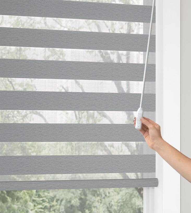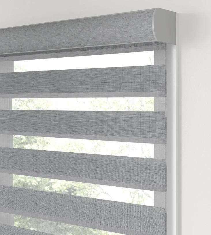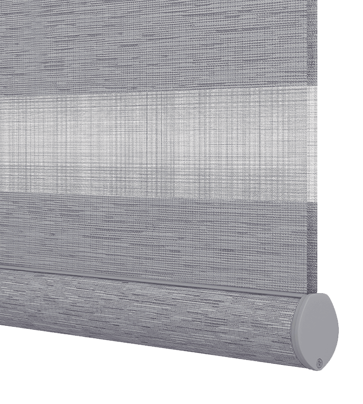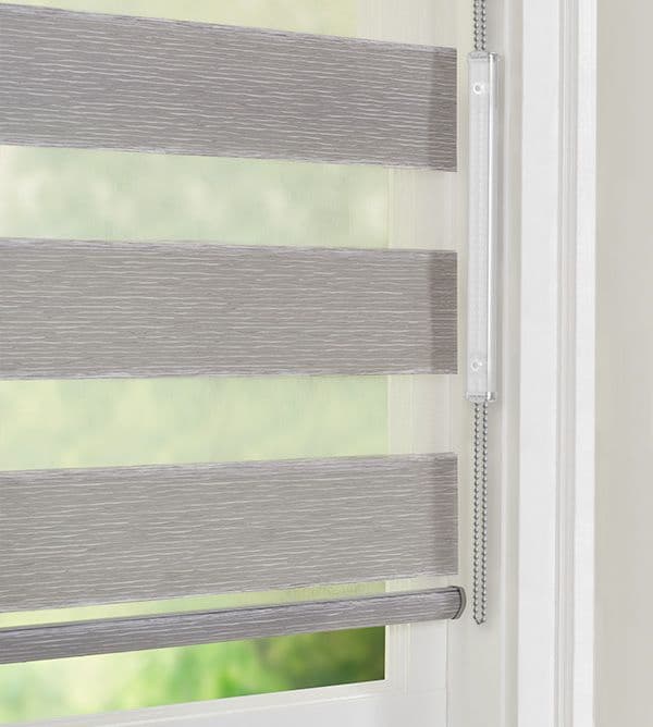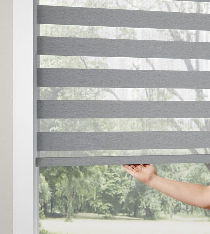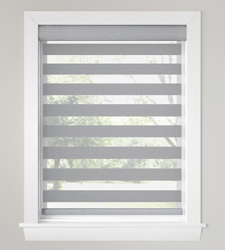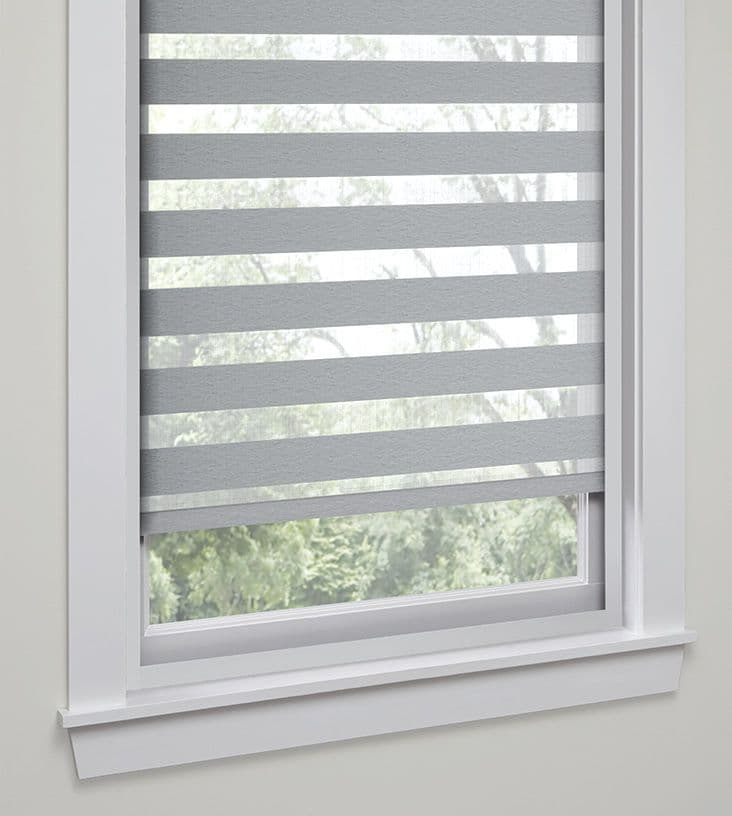A modern and versatile window treatment that will transform any room. Banded shades, also referred to as dual shades or zebra shades, combine solid and sheer linear bands to form a single shade that gives you precise light control. When aligned, solid bands seamlessly block natural light and ensure privacy; when shifted, the sheer bands transition to diffuse light and reveal the view.