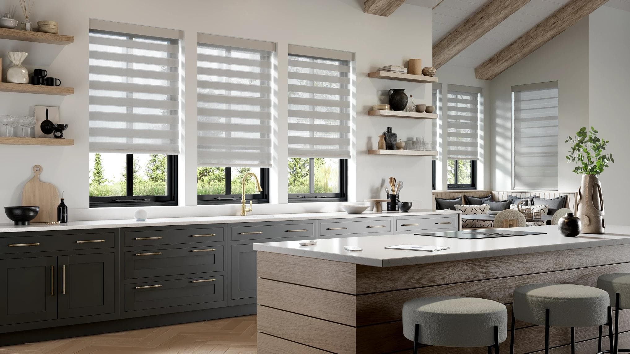 Solid bands and lineal sheers unite for a gorgeous combination of colorful accents or neutral hues. From translucent styles that bring your space to life to room darkening shades that help put you to sleep — a perfect solution awaits.